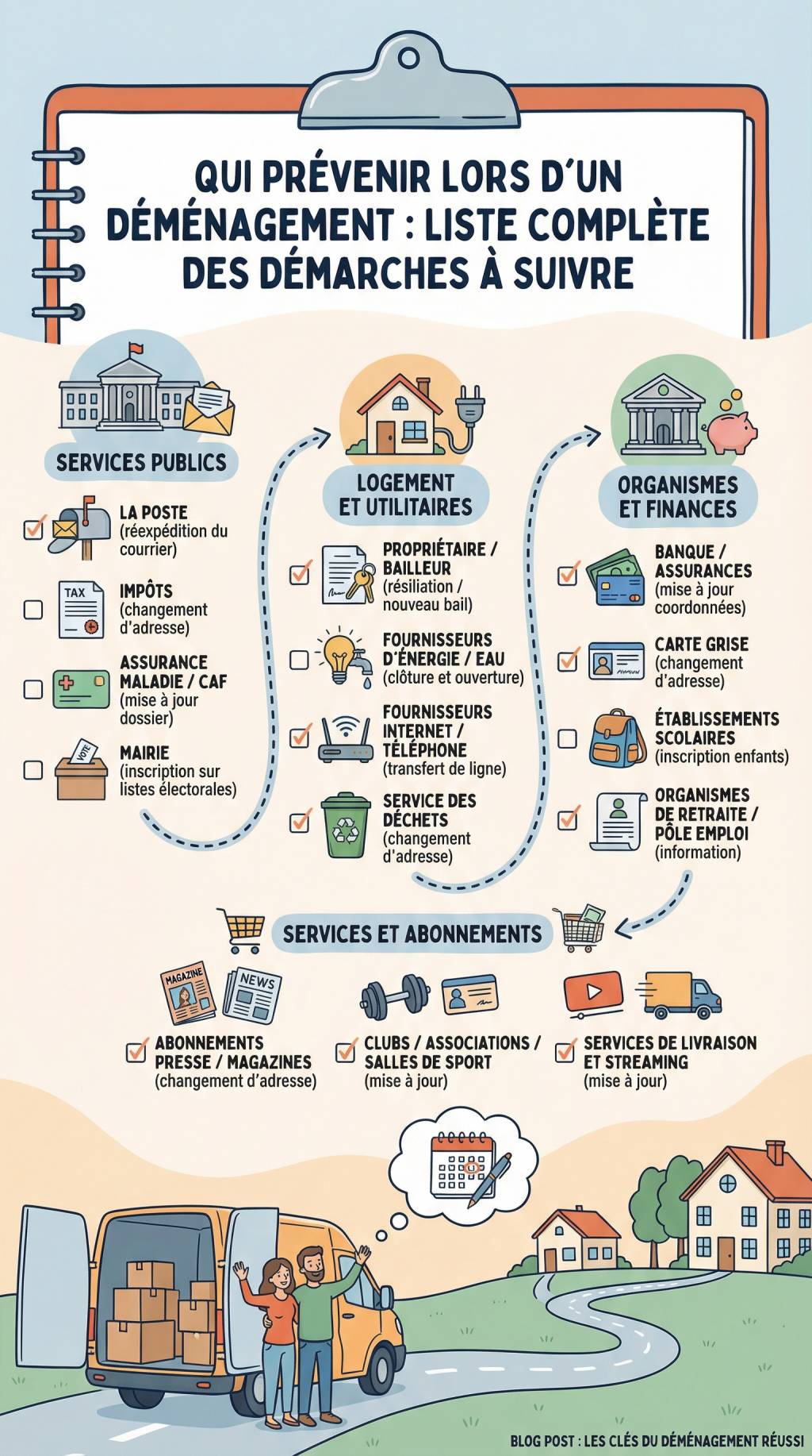 C’est une étape clé. Elle évite une partie des courriers égarés et simplifie les démarches suivantes. Selon votre situation, vous devez prévenir plusieurs organismes :